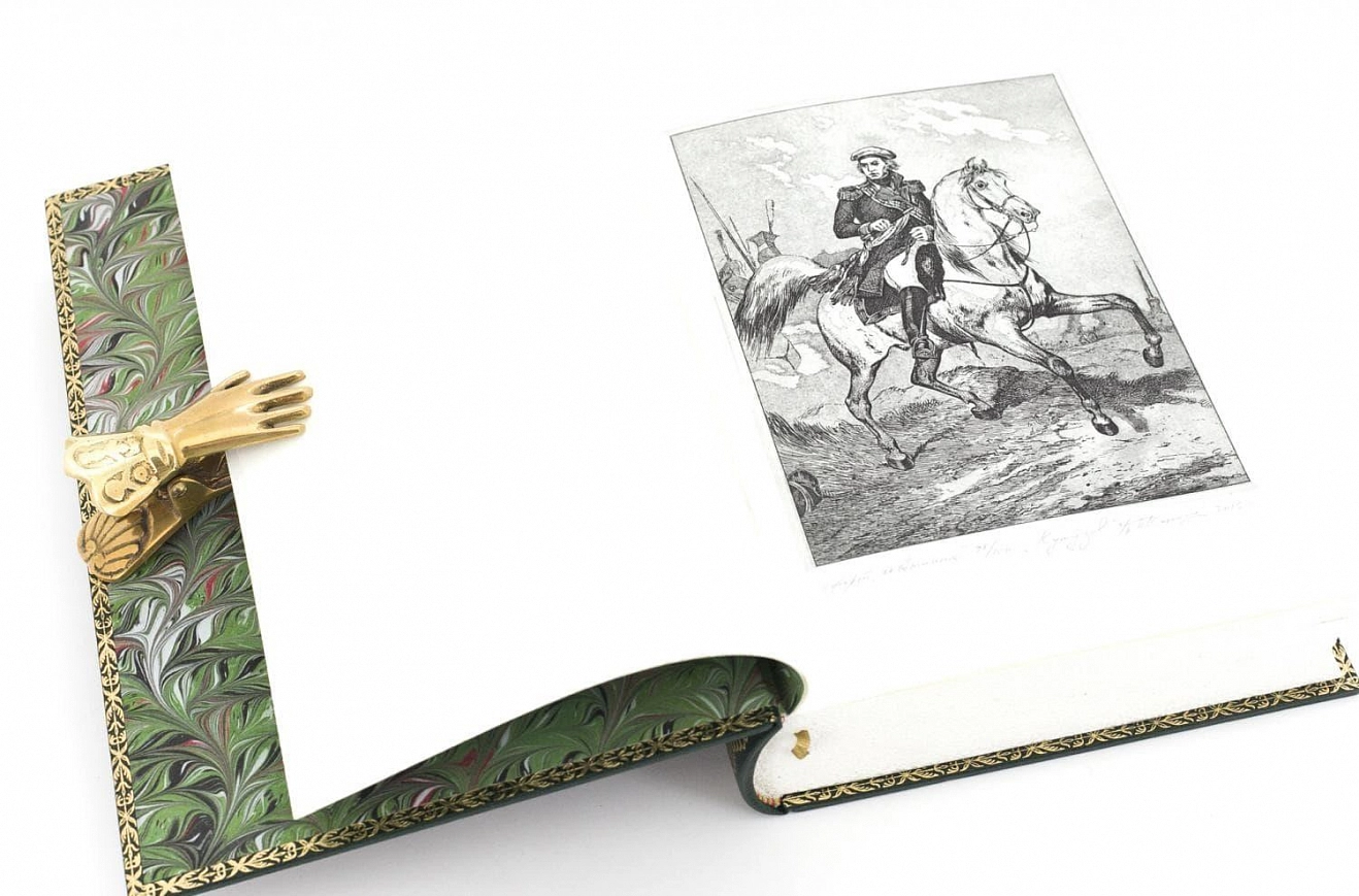 Это эксклюзивное издание в переплете из натуральной шагреневой кожи, выполненном по старинной технологии и украшенном золотым, цветным и блинтовым тиснением. Верхний обрез окрашен и гравирован вручную. Полукожаный футляр.