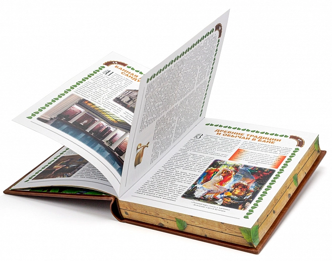Книга о бане, все и даже больше в кожаном переплете с индивидуальным тематическим тиснением. Отпечатана на дизайнерской бумаге, обрезы книжного блока украшены рисунками. Книга получилась очень интересной по содержанию и стильно оформленной, великолепный подарок ценителям таких мероприятий.