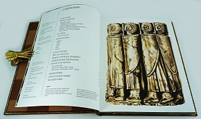 Для книги изготовлен фигурный футляр с кожаной окантовкой.
