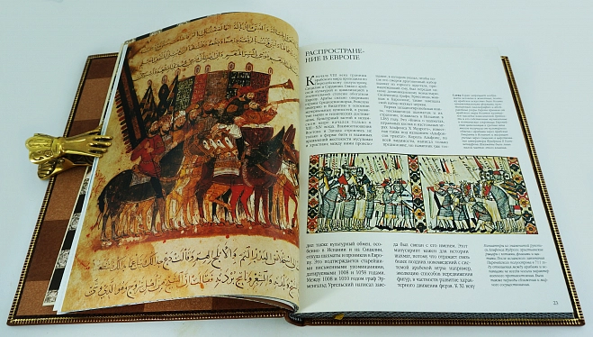 Подарочная книга "Шахматы. 2000 лет истории" Розвин Финкенцеллер, Вильгельм Цир, Бюрер Эмиль. АННОТАЦИЯ Эта книга предлагает обобщение современных исследований происхождения и распространения королевской игры, представляет основные вехи ее развития. В ней рассказано об индийской и арабской игре, о первых профессиональных шахматистах, о сути игры и роли каждой фигуры в ней, о национальных школах, о легендарных мастерах и их партиях. ОПИСАНИЕ Пер. с англ. и нем.: А. О. Демин, А. И. Минеев, Н. Н. Киндеев. - Санкт-Петербург. Славия, 2003. - 208 с. : ил., портр., факс., цв. ил., портр., факс. Формат 24 х 30 см. Для книги изготовлен библиофильский переплет из натуральной кожи, с художественным, тематическим тиснением, имитирующем шахматную доску, и инкрустацией белой шагреневой кожей. Блок перешит на шнуры (французский переплет), обрезы окрашены и гравированы вручную. Форзац выполнен из дизайнерской бумаги, декорированной горячим тиснением в стиле обложки. Периметр окатан вручную золотистым бордюрным орнаментом. Для книги изготовлен фигурный футляр с кожаной окантовкой. Эксклюзивное исполнение переплёта.