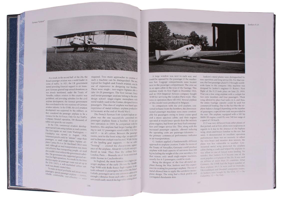 History of airplan АННОТАЦИЯ К книге подробно рассмотрены все этапы и направления развития самолетов за время от появления первых проектов "летательных машин" до наших дней. Предназначена как для специалистов, так и для широкого круга читателей, интересующихся авиацией. Книга "История самолетов мира" издана на двух языках:русском и английском. Английская версия подготовлена при участии индийских авторов и организаций. Предисловия к "Истории самолетов мира" написаны Президентом ОАО "Объединенная авиастроительная корпорация", академиком Российской академии наук, доктором технических наук М.А.Погосяном, Председателем Комитета Совета Федерации РФ по обороне и безопасности В.А.Озеровым и Генеральным директором ООО "Русавиа",кандидатом технических наук С.Н.Барановым.Введение к английскому изданию написано Председателем "Хиндустан Аэронотикс Лимитед"(Индия), доктором технических наук Р.К. Тяги. ОПИСАНИЕ Цельнокожаный переплёт ручной работы, украшен серебряным и цветным тиснением. Корешок декорирован бинтами.Текст книги напечатан на мелованной бумаге и дополнен чёрно-белыми иллюстрациями. Обрез оформлен в технике "Перо павлина". Ляссе из шёлковой ленты. Форзац цельный из дизайнерской бумаги. Дублюра окатана золотом. Книга представлена в оригинальном подарочном коробе, перчатки и, по желанию, сертификат (может быть именным) в комплекте.Цветовое сочетание переплёта и упаковки может отличаться от представленных на фото.
