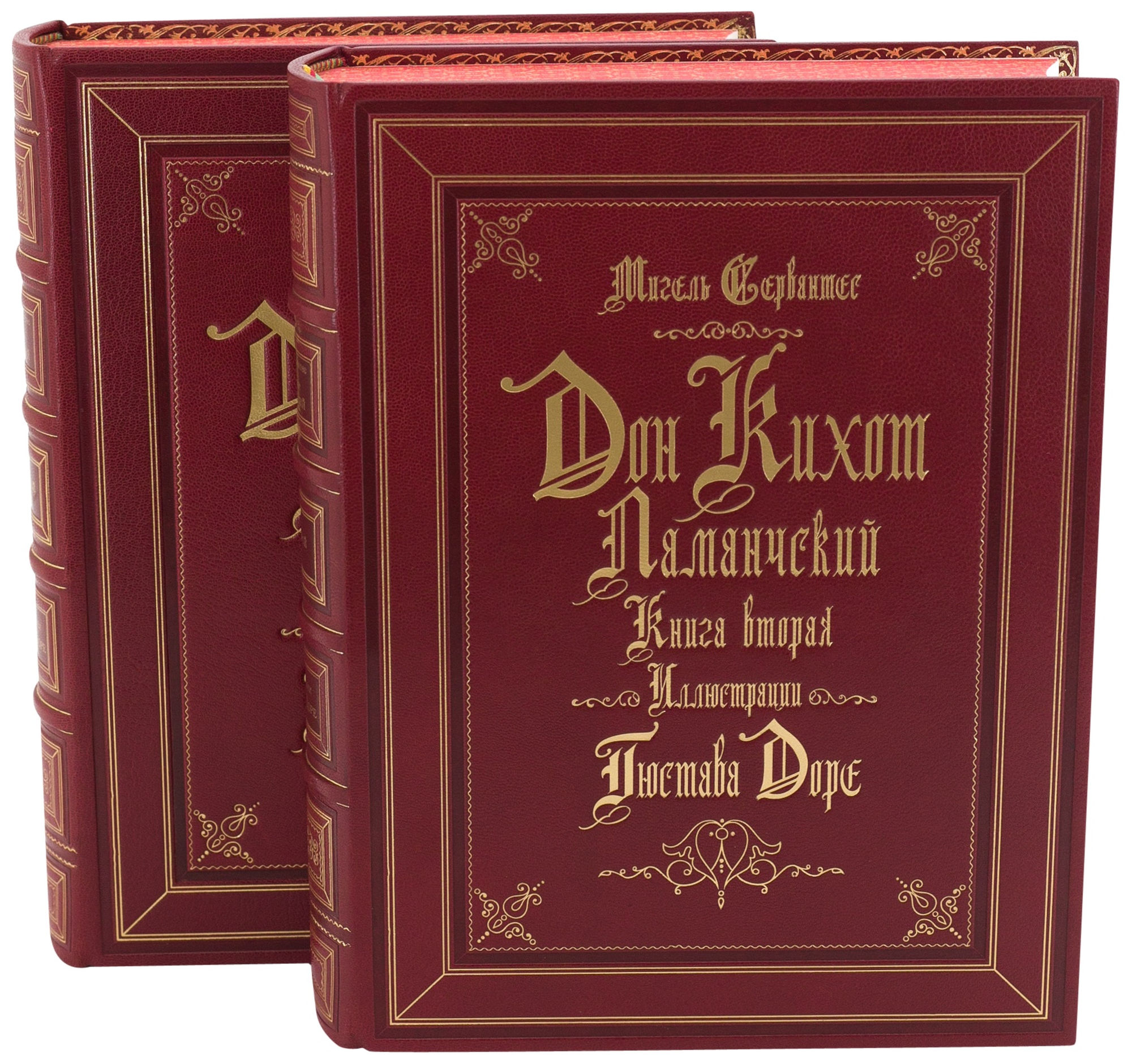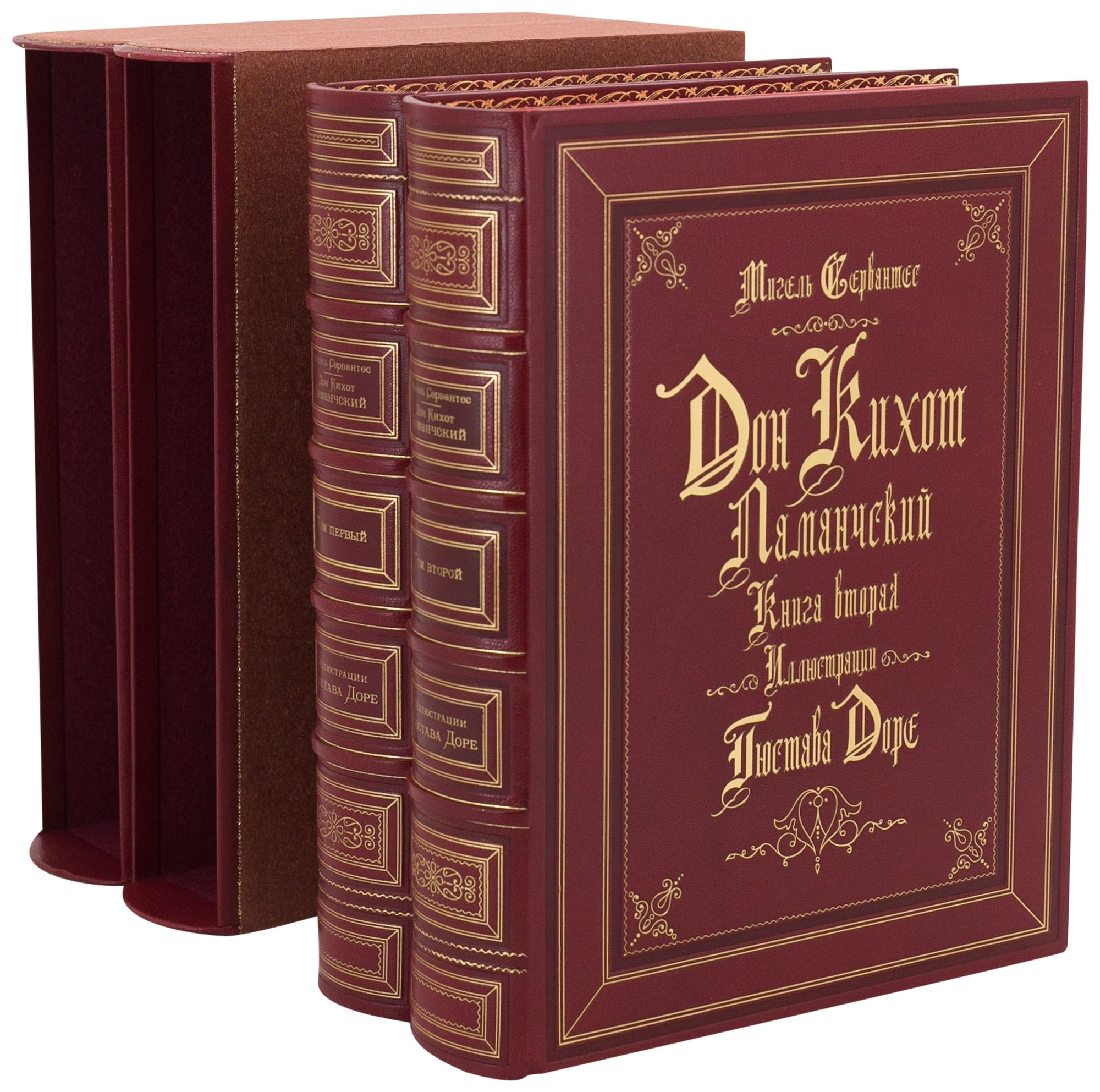 Подарочные книги "Дон Кихот Ламанческий" Мигель де Сервантес Сааведра АННОТАЦИЯ Четырехвековая слава «Дон Кихота» говорит лучше всякой критики. Не удивительно, что это популярное произведение привлекло внимание такого известного и талантливого художника, как Гюстав Доре. В 1863 году вышла первая книга с иллюстрациями этого великого француза. Издание включает 2 тома. Именитый художник создал 378 гравюр, которые поражают даже знатоков его творчества. Действительно, союз двух великих — писателя Мигеля де Сервантеса и художника Гюстава Доре — дал поистине завораживающий результат. Неповторимые образы Санчо Панса, Дон Кихота и его славного коня Росинанта оставят неизгладимый отпечаток в душе читателя. Существует мнение, что именно Доре первым нарисовал «рыцаря печального образа» таким, каким теперь он предстает в воображении каждого, — долговязым худым стариком. Первая часть «Хитроумного идальго Дон Кихота Ламанчского» увидела свет в далеком 1605 году, и уже тогда ее успех превзошел все ожидания. В течение нескольких лет в Испании разошлись 30 000 экземпляров — совершенно невероятный пример для того времени. В те годы слава произведения Мигеля де Сервантеса распространилась во множестве стран: в Португалии, Италии, Франции и Нидерландах многие специально учили испанский язык, чтобы прочесть эту книгу в оригинале. Некоторые биографы Сервантеса утверждают, что его единственной целью при создании «Дон Кихота» было излечение современников от чрезмерной любви к рыцарскому роману. Действительно, Сервантес в авторском предисловии и сам сознается, что имел в виду эту цель. Но за ней скрывалась еще одна, более существенная: изобразить, как в зеркале, все недостатки того времени и вместе с тем свою собственную жизнь. Данное издание сопровождается полной коллекцией гравюр Доре, воспроизведенных по книге: L’ingenieux hidalgo Don Quichotte de la Manche. — Paris, Librairie de L. Hachette et Cie, 1869. Текст приводится по изданию Товарищества И.Д. Сытина «Дон Кихот Ламанчский» (1904) в полном переводе с испанского под редакцией Н.В. Тулупова, а также вступительной статьей. ОФОРМЛЕНИЕ Книга (формат 23,5 х 30 см) исполнена по старинной французской технологии; Переплет цельнокожаный, из натуральной шагрени (Франция); Бумага верже, кремовая; Блок сшит на пяти шнурах; Форзац выполнен из мраморной бумаги ручного крашения; Дублюра окатана вручную 23-каратным золотом; Обрез блока с художественным оформлением; Ляссе шелковое, каптал ручного плетения; Индивидуальный футляр; Издание включает 2 тома