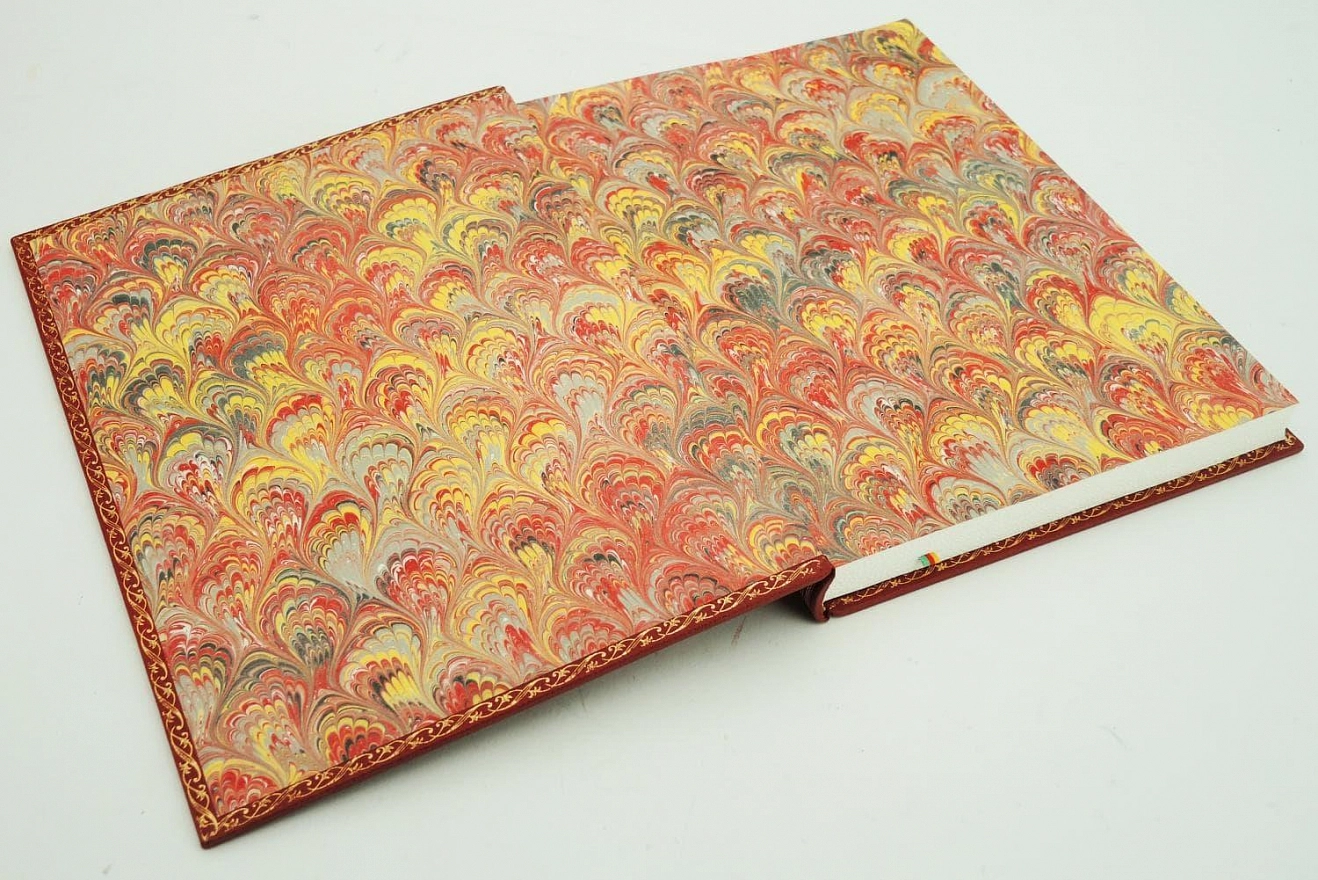 - Форзац выполнен из мраморной бумаги ручного крашения;