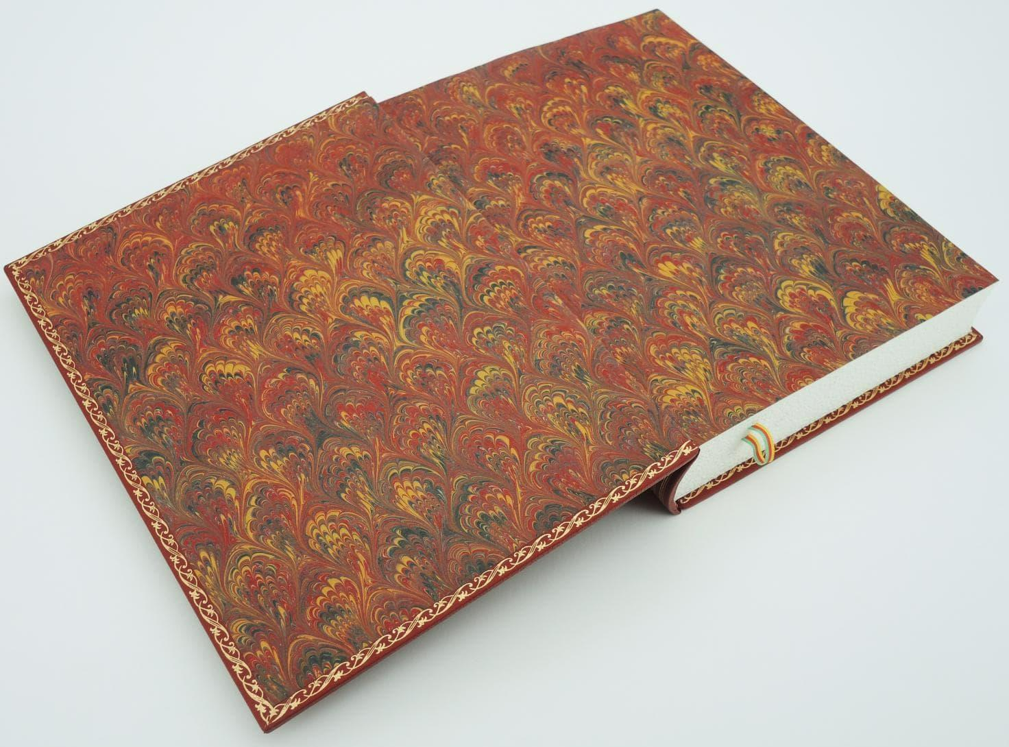 - Форзац выполнен из мраморной бумаги ручного крашения;