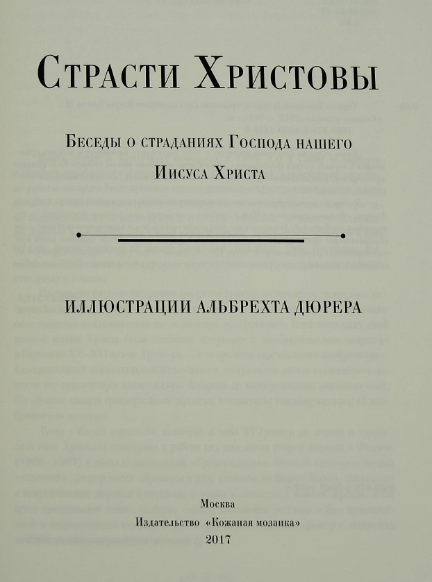 Книга «Страсти Христовы» появилась в 1902 году в Санкт – Петербурге и являлась приложением к журналу «Отдых Христианина», важнейшими аспектами работы которого было духовное просвещение, распространение религиозного знания и, в частности, доступное изложение евангельских сюжетов. Настоящее издание украшают два цикла гравюр знаменитого немецкого мастера Альбрехта Дюрера: «Большие страсти» и « Малые страсти», получившие свое название исключительно из-за размера изображений. Дюрер создавал свои циклы гравюр не для иллюстрирования книг, а как самодостаточное произведение. И хронологический разрыв между первым изданием книги и ее иллюстративным рядом значителен: почти 400 лет. Однако общая тема – страдания Христа – их объединяет. И великолепные гравюры мастера усиливают эффект от проникновенных глав книги.
