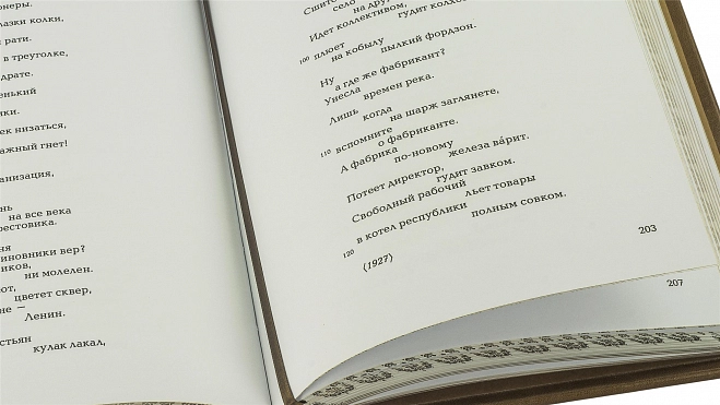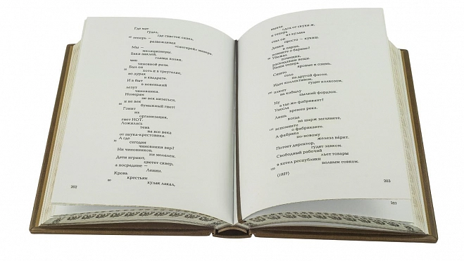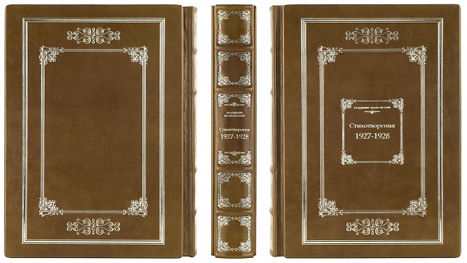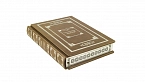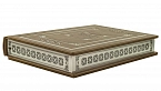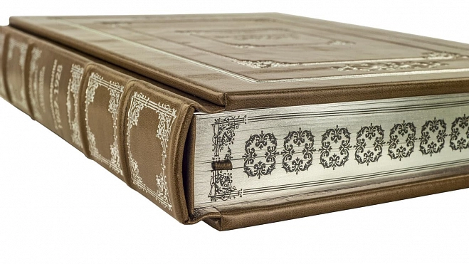 Составной переплет «Брадель» ручной работы, выполнен из натуральной кожи «Pullup Brown» производства итальянской кожевенной фабрики «Carisma». Обложка книги оформлена рельефным золотым тиснением с использованием фольги «Luxor 240». Обрез книги выполнен в авторской технике позолоты с нанесением орнамента.