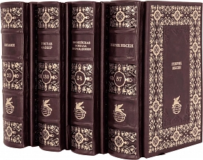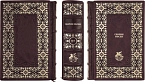 Составной переплет «Брадель» ручной работы, выполнен из натуральной кожи «Robbat Cherry» производства итальянской кожевенной фабрики Carisma». Обложки книг двухуровневые, оформлены комбинацией многоуровневого объемного тиснения: глубокого блинтового, рельефного золотого, c использованием фольги «Luxor 240». Обрезы книг выполнены в уникальной технике позолоты с нанесением орнамента. По желанию клиента на заднюю обложку каждого тома может быть оттеснена семейная монограмма (суперэкслибрис), что переводит собрание в разряд фамильной библиотеки, которая будет передаваться из поколения в поколение.