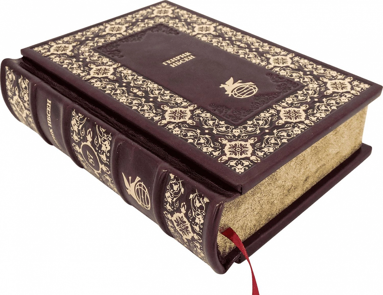 Составной переплет «Брадель» ручной работы, выполнен из натуральной кожи «Robbat Cherry» производства итальянской кожевенной фабрики Carisma». Обложки книг двухуровневые, оформлены комбинацией многоуровневого объемного тиснения: глубокого блинтового, рельефного золотого, c использованием фольги «Luxor 240». Обрезы книг выполнены в уникальной технике позолоты с нанесением орнамента. По желанию клиента на заднюю обложку каждого тома может быть оттеснена семейная монограмма (суперэкслибрис), что переводит собрание в разряд фамильной библиотеки, которая будет передаваться из поколения в поколение.